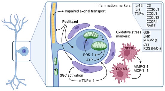 Pathomechanisms of paclitaxel-induced peripheral neuropathy in the peripheral nervous system. ATP—adenosine triphosphate, C3—complement component 3, CD11b—cluster of differentiation 11B, CD163—cluster of differentiation 163, CX3CL1—C-X3-C motif ligand 1, CXCL1—C-X-C motif chemokine ligand 1, CXCL12—C-X-C motif chemokine ligand 12, CXCR4—as C-X-C chemokine receptor type 4, GSH—glutathione, IL—interleukin, JNK—c-Jun N-terminal kinase, MCP-1—monocyte chemoattractant protein 1, MMP—matrix-metalloproteinase, RAGE—receptor for advanced glycation end products, ROS—reactive oxygen species, SGC—satellite glial cell, TNF-α—tumor necrosis factor; Created with BioRender.com (accessed on 20 September 2021).