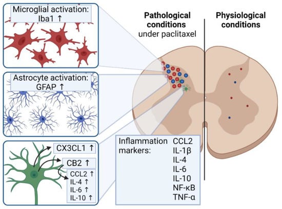 Pathomechanisms of paclitaxel-induced peripheral neuropathy in the spinal cord. CB2—cannabinoid receptor type, CCL2—C-C motif ligand 2, CX3CL1—C-X3-C motif ligand 1, GFAP—glial fibrillary acidic protein, Iba1—ionized calcium-binding adapter molecule 1, IL—interleukin, NF-κB—nuclear factor kappa B, TNF-α—tumor necrosis factor; Created with BioRender.com (accessed on 20 September 2021).