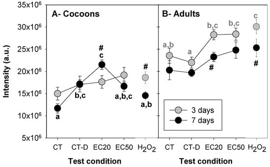 - Novais, S.C.; Gomes, S.I.L.; Gravato, C.; Guilhermino, L.; De Coen, W.; Soares, A.M.V.M.; Amorim, M.J.B. Reproduction and biochemical responses in Enchytraeus albidus (Oligochaeta) to zinc or cadmium exposures. Environ. Pollut. 2011, 159, 1836–1843. [Google Scholar] [CrossRef]