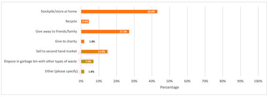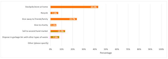 When it comes to mobile phones, it was observed in the results section that the majority of respondents tend to store their obsolete mobile phones at home, with an average of 3.85 stored mobile phones per household. A similar result was observed in a study by [] in India with over 50% of respondents in their studies storing their obsolete mobile phones at home. This shows that multiple reasons can make consumers more reluctant to recycling their mobile phones. For example, some consumers tend to have a sentimental attachment to their old mobile phones and give them inherent value, and some others have worries about data security resulting in stockpiling their old mobile phones for many years.