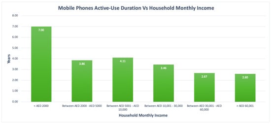 The average mobile phones active-use duration was further analysed with respect to household monthly income. From Figure 16, and when compared to respondents with higher household income, it was observed that mobile phones are used for longer durations by respondents with low household income. The shortest average useful lifespan was observed to be 2.60 years for respondents with a household income of higher than AED 60,001, which in other words means that households with higher incomes tend to replace their mobile phones more often thereby generating more waste mobile phones. Hence, mobile phones awareness programs should also put a great focus on households with high income as they tend to generate more waste mobile phones.