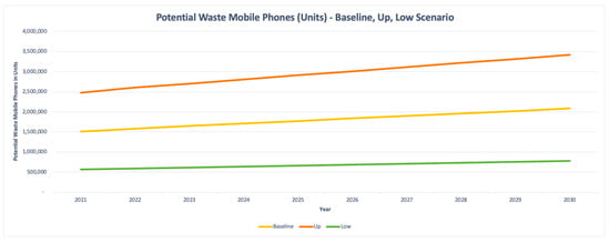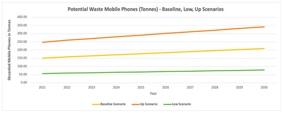 Waste mobile phones—baseline, up, and low scenarios (tonnes).