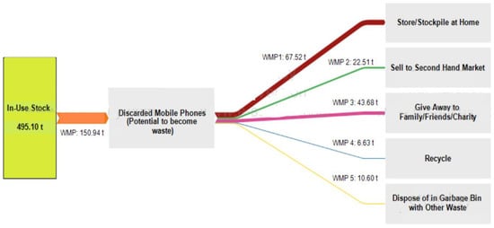 To further simplify the possible pathways when drawn on the e!sanky tool, the percentage of respondents who giveaway their discarded mobile phones to family or friends was combined with charity donation. Also, 1.8% of respondents who selected the “others” option stated that they tend to keep their unused mobile phones for themselves for future use if needed. This percentage was combined with the percentage of people who tend to store their mobile phones at home.