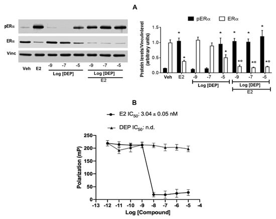 ERα activation and in vitro binding assays. Western blot (left panel) and corresponding densitometric analysis (right panel) of Ser118-phosphorylated ERα and total ERα protein level in MCF-7 treated for 1 h with the endogenous ERα ligand E2 (10−8 M) as positive control, and a dose curve of DEP at 10−9, 10−7, and 10−5 M in the presence or absence of E2 co-treatment (A). The vinculin levels were used as an internal control of protein loading. Data are means ± SD of at least four experiments. p < 0.01 was determined by the ANOVA test followed by the Bonferroni post-test vs. Veh (*) and E2 (°). In vitro ERα competitive binding assay for the endogenous ligand E2 and DEP performed over the 10−12–10−5 M range by using fluorescent E2 as a tracer. Inhibitor concentration (IC50- nM) is indicated in the panel for each compound (B).