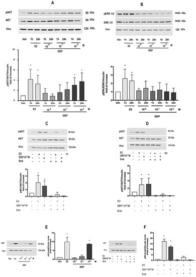 ERα phosphorylation and degradation are critical events directly linked with the function of this receptor as a ligand-activated transcription factor; moreover, these mechanisms integrate the nuclear and extra-nuclear estrogen signals [,,,,,]. We then analyzed the downstream consequence of the DEP-induced E2-mimetic effect on receptor activation. In particular, the effect of DEP treatment on the main ERα-activated extra-nuclear cascade pathways pivotal for E2-induced cell proliferation (i.e., PI3K/AKT and ERK/MAPK) was evaluated at short-term (1 h) and long-term (24 h) exposures of diverse DEP concentrations. As previously reported [,], E2 treatment induced rapid (1 h) and persistent (24 h) ERK1/2 and AKT phosphorylation, whereas only DEP 10−5 M mimicked the rapid and persistent AKT activation (Figure 2 A) without any parallel effect on the ERK pathway activation (Figure 2B). Pre-treating MCF-7 cells with the ERα-specific inhibitor endoxifen (End, 10−6 M; 1 h pre-treatment) completely abolished the rapid (1 h, Figure 2C) and persistent (24 h, Figure 2D) effect of both E2 (10−8 M) and DEP (10−5 M) on AKT phosphorylation.