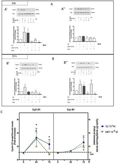 It is well known that E2-dependent activation of ERα promotes DNA synthesis, cell cycle progression, and cell proliferation in estrogen-sensitive breast cancer cells (i.e., MCF-7) [,]. Prompted by the identification of DEP-dependent activation of ERα-based pathways important for E2-induced cell cycle progression (i.e., AKT activation), we investigated the DEP effect on cell proliferation-related intracellular events. As previously shown [,,,,,], cyclin D1 is under the indirect control of the E2/ERα pathway and is involved in the G1/S transition. Moreover, the cyclin B1 protein, which is necessary for G2/M passage, is also positively regulated by E2 in breast cancer cells []. Therefore, we analyzed the effect of DEP treatment at the 10−5 M concentration on the expression of both cyclins D1 and B1 at two different time points, 24 h and 72 h. The time of administration was chosen because it is known that the MCF-7 doubling time is 55 ± 11 h []. As reported in Figure 3A and in other reports [], E2 (10−8 M) increased cyclin D1 but not cyclin B1 levels at the 24 h time point (Figure 3A). As with E2 treatment, DEP (10−5 M) stimulation did not modify the expression levels of cyclin B1 but significantly increased those of cyclin D1 at 24 h (Figure 3A). The same analysis conducted 72 h after the stimulation revealed that E2 up-regulated both cyclin D1 and cyclin B1 levels (Figure 3B), whereas DEP treatment promoted only the accumulation of cyclin B1 (Figure 3B”). The effect of DEP on cyclin D1 and cyclin B1 was completely abrogated by End (10−6 M; 1 h before) pre-treatment (Figure 3A’,B”), indicating an ERα-dependent mechanism. On the other hand, End pre-stimulation was able to block only the E2 effect on the modulation of cyclin D1 but not of cyclin B1, suggesting that E2 regulation of cyclin B1 could be more complex (e.g., the regulation of its expression could be dependent on the progression of the cell cycle). Furthermore, the fact that treatment with End alone or in combination with DEP significantly decreased the cyclin D1 (24 h, 72 h, Figure 3A’,B’) and cyclin B1 (72 h, Figure 3B”) levels significantly below the control conditions may support a critical role exerted by ERα in the regulation of the cell cycle and in the absence of any direct ligand/interactor. The reported results evidence that DEP exposure promoted the expression of critical E2-controlled regulators of the cell cycle through an ERα-dependent mechanism. This mechanism shows a “timing”, which was completely superimposable on that reported for E2 treatment with respect to cyclin B1 (i.e., increased levels at 72 h), whereas it did not completely coincide with respect to cyclin D1 levels (Figure 3C). Indeed, in the latter case, only E2 was able to maintain a persistent increase in the protein after 72 h; however, a decline in the protein level was evident beyond the 24 h time point (Figure 3C).