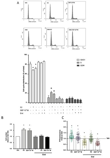 The effect of DEP on ERα-dependent DNA synthesis, cell cycle progression, and proliferation. Cell cycle analysis in MCF-7 cells treated with DEP 10−5 M for 24 h with or without pre-stimulation with End (10−6 M, 1 h before). Upper panels show flow cytometry analysis for cell cycle distribution of MCF-7 cells under different treatment conditions. The bottom panel shows the percentage of cells in G0/G1, S, and G2/M phases with respect to different stimulations. Histograms are representative of at least three independent experiments (A). Viable cell number (B) and analysis of total DNA content obtained from propidium iodide (PI) assay (B) of MCF-7 cells treated with DEP 10−5 M for 72 h in the presence or absence of End pre-treatment (10−6 M, 1 h before). Data are shown as fold of increase in Vehicle condition represented by the blank column (B) or as the dotted line (C). E2 stimulation with or without End pre-stimulation was used as positive control. p < 0.01 was determined by the ANOVA test followed by the Bonferroni post-test vs. G0/G1 phase Veh (-,-,-) and Veh (B,C) (*) or vs. S phase Veh (-,-,-) (°).