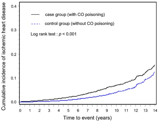 From 2003 to 2017, the number of cases with IHD among the CO poisoning and control groups were 729 and 386, respectively. The risk of developing IHD was significantly higher for the CO poisoning group than the control group by approximately 2.2 times (crude HR, 2.19; 95% CI, 1.91–2.51). The risk was significantly higher for the case group than in control group, even after adjusting for residential area, household income, and the presence or absence of comorbidities (adjusted HR, 2.16; 95% CI, 1.87–2.49) (Table 2). The reverse Kaplan–Meier survival curves showed that the cumulative incidence of IHD over time was consistently significantly higher among the CO poisoning group than among the control group (log-rank test: p < 0.001; Figure 2).