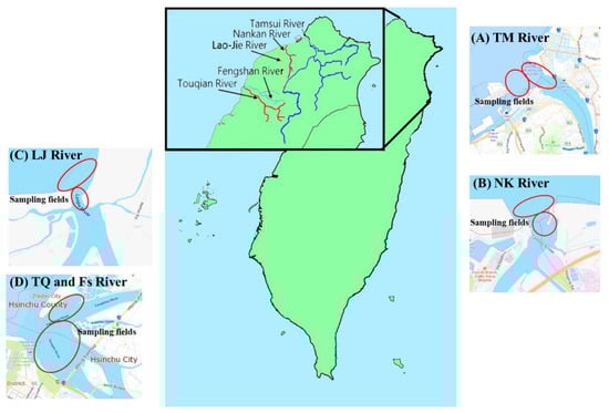 The fish were caught in the estuaries of five main rivers in northern Taiwan. The 130 pooled fish samples were investigated in the present study. The abbreviations of Tamsui, Nankan, Lao-Jie, Fengshan, and Touqian Estuaries are TM, NK, LJ, FS, and TQ, respectively. The sampling locations are shown as red circles in five river estuaries: (A) TM, (B) NK, (C) LJ, and (D) FS and TQ.