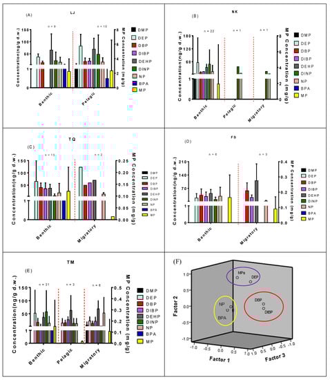Distribution of EEDCs in estuarine fish samples collected from northern Taiwan. The estuarine fish could be assigned into three groups (benthic, pelagic, and migratory) based on the fish habitat. The estuarine fish levels of PAEs, BPA, NP, and MPs in the estuarine rivers were as follows: (A) Lao-Jie (LJ), (B) Nankan (NK), (C) Touqian (TQ), (D) Fengshan (FS), (E) Tamsui (TM), and (F) Principal component analysis for EEDC residues in the estuarine fish.