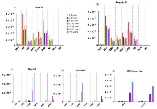 The mean DIs of different age groups were calculated for individual EEDCs through the consumption of estuarine fish and are shown in Figure 3A,B for males and females, respectively. Children, including infants, toddlers, young children, and school-age children, were exposed to higher EEDC DIs than adolescents and adults, based on relatively low BW for children. The highest mean estimated DIs of ΣPAEs, BPA, NP, and MPs were evaluated for 3–6 ages as 29.0 × 10−5, 1.13 × 10−6, 3.31 × 10−5, and 3.56 × 10−7, respectively, among the age groups. Figure 3 C, D shows the mean estimated HQs of seven EEDCs, such as DEP, DBP, DEHP, DIBP, DINP BPA, and NP, for males and females in the different age groups, and our values were notably lower than 1.00, indicating no non-cancer risks were found in the present study. The values (Rs) of cancer risk for DEHP ranged between 1.36 × 10−8 and 1.80 × 10−7 and between 7.32 × 10−9 and 1.55 × 10−7 in males and females, respectively, and were significantly below the critical value of 1.00 × 10−6. No cancer risk was found in our age groups.