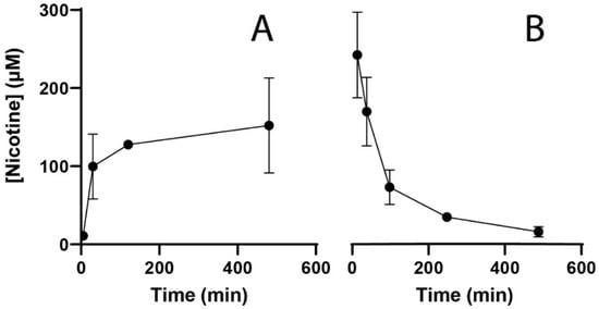 Intraembryonic nicotine concentrations quantified by LC-MS analysis of 10 pooled embryos per sample. (A) Measurement of absorption at 5, 30, 120, 480 min after start of exposure to 30 µM nicotine (nominal external concentration). A fast increase in the intraembryonic nicotine concentration is observed, with a plateau phase starting at >2 h. (B) Measurement of intraembryonic nicotine concentration at 5, 30, 90, 240, and 480 min after cessation of a 24 h exposure to 30 µM nicotine. Upon cessation of external exposure, the intraembryonic nicotine concentration is cleared fast. Data points represent the average of two independent pooled samples of 10 embryos each.