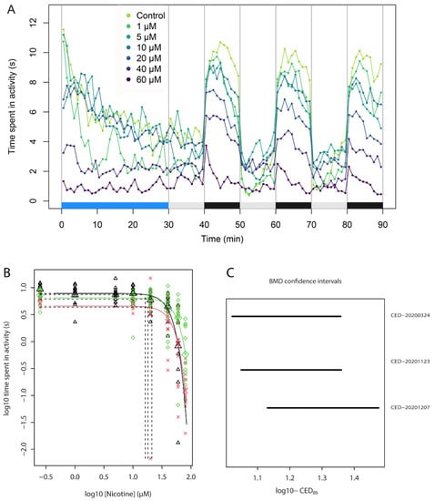 The following are available online at https://www.mdpi.com/article/10.3390/toxics9100250/s1, Figure S1: Analysis of embryotoxicity in the ZFET, Table S1: CED’s and confidence bounds at CES = −0.05 (−5%)., Figure S2: Confidence intervals of experiments using the full 10-min Dark block (left) vs. its middle 6-min section, Table S2: BMD confidence bounds at CES = −0.5 (−50%), Figure S3: Concentration-response analysis showing fitted concentration-response curves for the effect of exposure to nicotine on locomotion, Figure S4: The effect of a concentration-range nicotine pre-treatment (96–104 hpf) on the effectivity of acute exposure to nicotine (40 µM, 118–120 hpf), Figure S5: Nicotine pre-treatment reduces the inhibitory effect of acute nicotine exposure on locomotion, Figure S6: Combined analysis of concentration-response data upon acute exposure to nicotine without (black) and with pre-treatment (30 µM; 96–104 hpf; red).