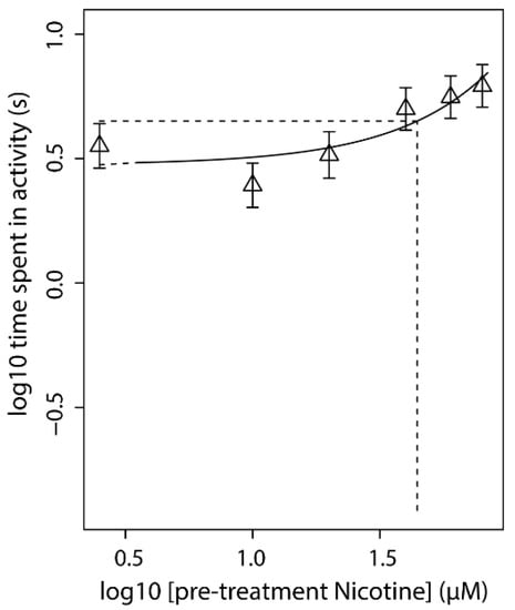 Pre-treatment of the embryos using a concentration range of nicotine concentration-dependently counteracted the effect of the acute exposure (Figure 3 and Figure S4). This suggests that pre-treatment with nicotine leads to habituation to the compound in a concentration-dependent way. These data indicate that pre-treatment with 30 µM nicotine (near CED50) induces a clear change in the response to acute nicotine exposure.