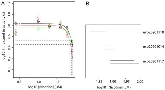 The effect of acute exposure to nicotine at 120 hpf was tested in three independent experiments in which nicotine reproducibly induced a concentration-dependent inhibition of locomotion (Figure 2B and Figure S3). In these experiments, nicotine showed a similar potency (CED50s 41.6–50.1 µM), supported by overlapping confidence intervals (Figure 2C). Based on these experiments, 40 µM was selected as an intermediate dose which induces a distinct effect on locomotion upon acute exposure. This concentration was used in subsequent experiments to assess whether pre-treatment of ZFE with nicotine in a dose range results in a shift in the efficacy of acute exposure.