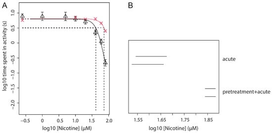 The combination of a fixed pre-treatment dose of 30 µM nicotine (96–104 hpf) with acute exposure to a concentration-range of nicotine was tested in three independent experiments. Combined concentration-response analysis of these three independent repetitions of the experiment with the experiment as co-variate produced close fits with overlapping confidence intervals for CED50, indicating no statistical differences between the experiments (Figure 4 and Figure S5). This analysis showed that the potency of the inhibiting effect of nicotine is decreased when compared to acute exposure to nicotine without pre-treatment, as indicated by the shift in CED50 value (CED50 Acute only: 41.6–50.1 µM; CED50 Acute with pre-treatment: 77.0–84.5 µM). This analysis was repeated in combination with data from the above three experiments of acute nicotine (Figure 2), confirming a lower potency of nicotine when acute exposure is preceded by pre-treatment (Figure 5A and Figure S6). This is indicated by the shift to the right of the pre-treatment + acute fit (red) as compared to acute alone (black), and further supported by a higher CED50 (72.9 µM) of the pre-treatment condition as compared to acute alone (CED50 = 41.2 µM). In the analysis with exponential models, this difference is statistically significant, given non-overlapping confidence intervals (Figure 5B).