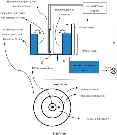 In this study, a falling-film photo reactor was designed, which is shown in Figure 1. Falling-film reactors provide a thin synthetic wastewater film, thus it generates low absorption of UV light especially in dark colors so dye degradation increases [28]. Most of the falling-film photo reactors are continuous, while a semi-batch photo reactor was designed in this study. In the designed photo reactor, the water contaminated by RR198 can be circulated many times; therefore, it does not require too much height or pump head.