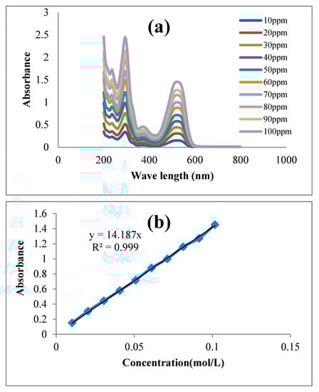 (a) The absorption of synthetic wastewater in various dye concentrations from 10 to 100 ppm between wavelengths of 200 and 800 µm, and (b) the relation between adsorption and the dye concentration.
