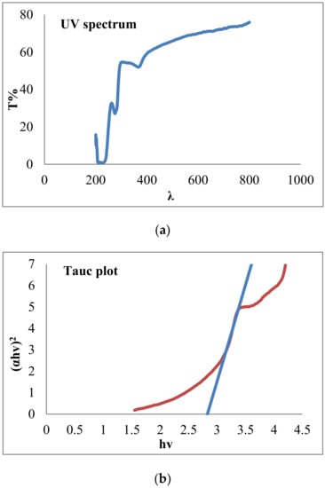 The bandgap value was obtained with a UV/visible spectrophotometer (Perkin-Elmer lambda 25), as reported by Chen and Jaramillo [29]. The device was set to achieve a transmission curve and showed a T% -λ plot. Then Equations (3) and (4) were used to calculate a and hv.