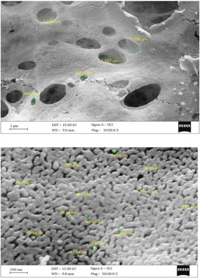 The SEM images proved that the particles were small enough to say that they were nanoparticles, and the crystal sizes were between 31.58 and 68.79 nm. Moreover, Figure 5 shows that the dimensions of created porosity had a maximum size of 1.557 micrometers. Based on the results, the nanoparticles contain porosities of different sizes. This can be related to the type of combustion synthesis and exhaust gases resulting from combustion, such as carbon dioxide and nitrogen dioxide. The shapes of nanoparticles are spherical and cubic.