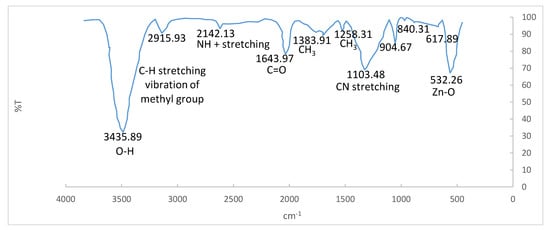 The ZnO-Nd photocatalysts produced by the combustion method were investigated by FTIR. In this research, a range of 450 to 4000 cm−1 was studied. As shown in Figure 6, peaks can be seen at 3435.89, 2142.13, 1634.97, 1383.91, 1258.31, 1103.48, 904.67, 840.31, 617.89, and 532.26 cm−1 and shown in Figure 6. The peak of 532.26 is for the metallic bond of oxygen and zinc (Zn-O) [33,34]. The peaks of 3435.89 and 2918.93 cm−1 are related to O-H and C-H stretching vibration of methyl groups. The peak of 1634.97 cm−1 is also related to C=O. The peak of 1103.48 is for C-N stretching, and 1383.91 cm−1 and 2142.13 cm−1 peaks are related to CH3 and NH+ stretching, respectively [35].