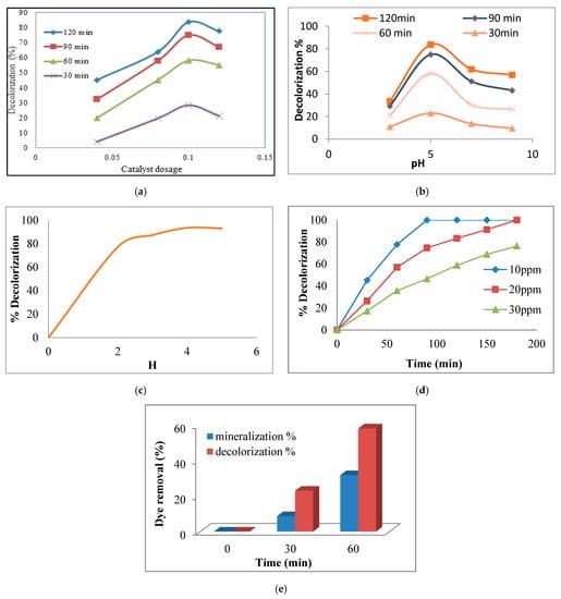 (a) Effect of catalyst dosage on decolorization efficiency at different HRTs (dye concentration of 20 ppm and pH 5); (b) the effect of pH on decolorization of RR198 at different HRTs (the dye concentration of 20 ppm and catalyst dosage 0.10 g/L); (c) decolorization plot on different amount of H [H2O2/Dye] (dye concentration of 20 ppm, catalyst dosage 0.10 g/L, and pH of 5); (d) decolorization of RR198 versus HRT for different dye concentration (catalyst dosage of 0.10 g/L and pH of 5); (e) decolorization and mineralization of RR198 at different HRTs (catalyst dosage of 0.10 g/L, dye concentration 20 ppm, and pH of 5).