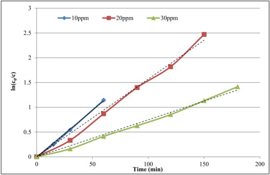 If ln(c0/c) is plotted versus time, the result will be a line. The slope of this line gives Kap. (Figure 8) The parameters k and R2 (correlation constant) of the decolorization process are shown in Table 1 [46].