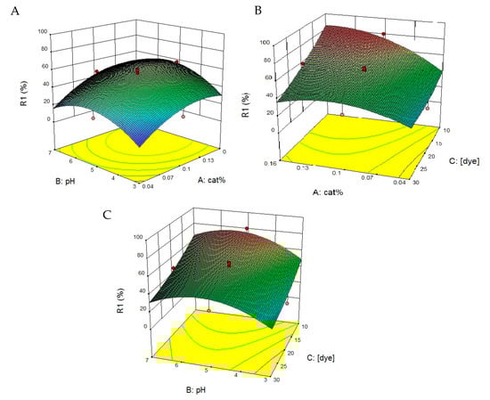 To show the destruction of RR198 dye by ZnO-Nd, 3-D plots of response surface were drawn. In each design, two parameters were changed while the third parameter was kept constant. Response surface plots are shown in Figure 9. This study showed that catalyst dosage and pH had a prominent effect on RR198 decolorization. By increasing the amount of catalyst from the optimum level, the amount of dye was reduced due to the prevention of light radiation. Interactive interaction (%cat × [dye]) was negative according to the regression coefficient (see Table S3 in Supplementary Materials). This shows that active sites (which increase with the increase in catalyst dose) were less than the number of dye molecules that add to the synthetic wastewater with increasing concentration. Thus, the antagonistic effect was dominant on the synergism in the interactive interaction. Finally, the best response predicted was the removal of an 81.85% dye at an HRT of 60 min.