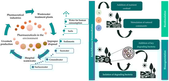 In this review, concerns regarding the occurrence and fate of pharmaceuticals, as well as their potential effects in different environments and in non-target organisms, are addressed. Among the different classes of pharmaceuticals, anti-inflammatory drugs, antidepressants, antibiotics and blood lipid lowering agents were chosen for a more accurate review, as they are among the most prescribed and consumed pharmaceuticals [,,]. Autochthonous bioremediation, using native bacteria, is raised as a solution for the recovery of contaminated environments, which involves exploring and enhancing natural biological mechanisms for the removal of pharmaceuticals (Figure 1). Several case studies showing the potential of this technology for further applications are presented.