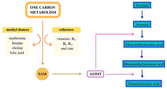 The metabolism of inorganic arsenic (iAs) was mainly analyzed in animal model studies, in vivo and in vitro. The iAs metabolism may vary considerably depending on the animal species []. Most mammals have the metabolism ability of iAs, and a limited metabolism ability has been observed in chimpanzees and marmoset monkeys [,]. The iAs metabolism in mice is much higher than in rats; this may be due to the fact that a large amount of DMA (dimethylarsinic acid) is accumulated in the red blood cells of rats []. The iAs metabolism involves alternate reactions of methylation and reduction to MMA (monomethylarsonic acid), DMA, and then these forms it are excreted by the kidneys. In most animal species, the major form of iAs excretion is DMA, and in humans, it can be excreted unchanged and as MMA and DMA [,,]. The methylation reactions of iAs are catalyzed by an enzyme—arsenic (+3 oxidation state) methyltransferase []. S-adenosyl-methionine, which is the donor of methyl groups, is important in the methylation process. S-adenosyl-methionine is synthesized in the one-carbon-metabolism (OCM) pathway. Various dietary compounds are involved in the OCM, mainly as methyl group donors: methionine, choline, betaine, folic acid, and moreover, cofactors of the reaction—e.g., vitamin B2, B6, B12 and zinc (Figure 1) [].