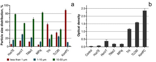 The results of the laser granulometry analyses are presented in Figure 1a. The optical density of the VEP suspensions is given in Figure 1b. According to the laser granulometry data (Figure 1a), the VEPs samples obtained from diesel-powered vehicles (i.e., THi, TLC80, and KomPC) had a higher number of particles in the size range of less than 1 µm compared with all the other samples. The results of the optical density measurement (Figure 1b) revealed the highest light absorption in the same samples (THi, TLC80, and KomPC). The correlation between the optical density of the suspensions and the particle size distribution was evaluated by computing the Pearson correlation coefficients. The analysis showed that the optical density significantly depended (p = 0.002) on the number of particles in the size ranges of less than 1 µm and 10–50 µm. Therefore, the higher share of particles less than 1 µm, the higher the optical density of the suspension, and vice versa for the share of particles in the size range of 10–50 µm, i.e., the higher share of the particles in the size range of 10–50 µm, the lower the optical density of the suspension. The number of particles in the size range of 1–10 µm had no significant effect (p > 0.05) on the optical density of the suspensions.