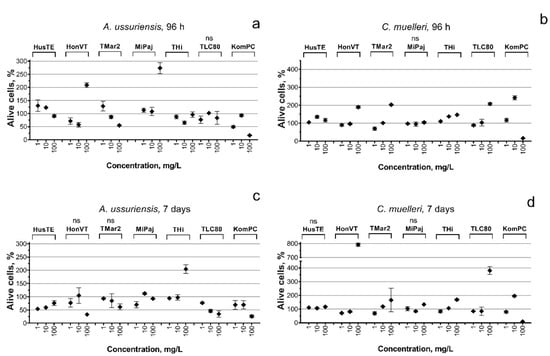 The influence of VEP samples on the microalgae growth rate: (a) A. ussuriensis after 96 h of exposure; (b) C. muelleri after 96 h of exposure; (c) A. ussuriensis after 7 days of exposure; (d) C. muelleri after 7 days of exposure; ns, the tested sample had no significant effect on the growth rate of microalgae (p > 0.05). The series without the mark “ns” significantly influenced the growth rate of the microalgae (p < 0.05).