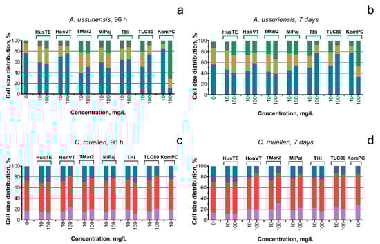 The influence of the VEP samples tested on the changes in the size of microalgae cells is presented in Figure 4. Almost all the samples caused enlargement of A. ussuriensis cells compared with the control (Figure 4a,b). The highest effect on the cells of A. ussuriensis was for the KomPC sample at the concentration of 100 mg/L. C. muelleri revealed no significant size changes after exposure to the VEPs.