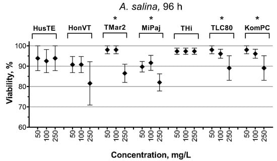 The results of the bioassay with brine shrimp nauplii showed neither immobilization nor lethal cases, even at the highest concentration of the VEPs (250 mg/L) after 24 and 48 h of exposure. The mortality of A. silina nauplii after 96 h of exposure to the VEPs is presented in Figure 4. Only the MiPaj sample caused the mortality of A. silina at the concentrations of 50 and 100 mg/L (Figure 5). At the concentration of 250 mg/L, all the tested VEP samples except THi caused mortality in between 10 and 30% of the nauplii. The THi and HusTE samples demonstrated the lowest toxicity to the brine shrimp nauplii compared with the other VEP samples.