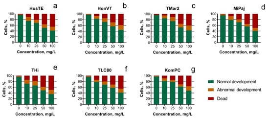 The state of S. intermedius embryo development after 24 h of the exposure to the tested VEP samples: (a) HusTE; (b) HonVT; (c) TMar2; (d) MiPaj; (e) THi; (f) TLC80; (g) KomPC.