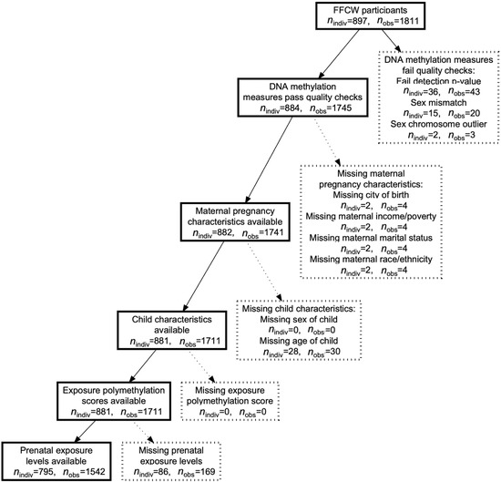 Fragile Families and Child Wellbeing (FFCW) Study sample flowchart. Boxes with solid lines on the left are included observations and individuals. Boxes with dashed lines on the right are excluded observations and individuals. N indiv represents the sample size of individual participants. N obs represents the number of DNA methylation observations. The number of observations can exceed the participants when repeated measures are available.
