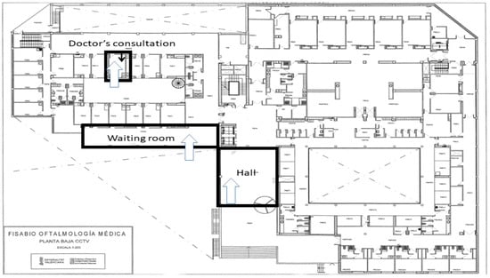 Map showing the sampling sites in the ophthalmological hospital: hall (2 doors, south orientation, 389.78 m3), waiting room (glazed wall and closed windows, south orientation, 281.46 m3), and doctor’s consultation (two doors, north orientation, 37.89 m3).