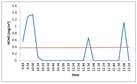 As to HCHO, it is used in the manufacture of sheet and insulation materials, primarily adhesives but also paints, cleaning agents, and cosmetics []. Formaldehyde levels in the hall and the waiting room were slightly higher than the guideline value (see Figures S8 and S9) in sporadic peaks (mainly at the beginning of the sampling period). Moreover, in the consultation room, these levels exceeded the guideline value at three moments (at the beginning, in the middle, and at the end of the sampling time frame) (see Figure 2). However, the obtained formaldehyde concentrations were, on average, lower than the guideline value over 8 h of exposure (0.3 ppm = 0.37 mg/m3) [].