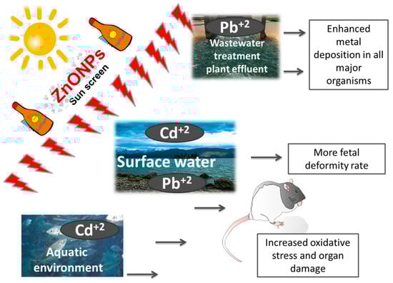 Zinc oxide nanoparticles (ZnONPs) have been used extensively as sunscreens that can easily be released into the water []. Because of their small size and large surface areas, ZnONPs adsorb numerous environmental contaminants [] (Figure 2). In wastewater treatment plant effluents, environmental ZnONPs concentrations were up to 45 μg/L []. Surface water ZnONPs concentrations were up to 74 μg/L in the United States [] and 1.84 μg/L in Singapore []. The environmental level of ZnONPs is inevitably increased as production volumes and applications increase [].