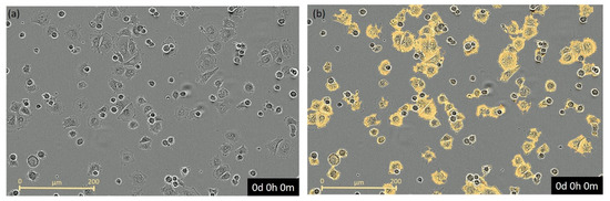Cells of Atlantic sturgeon (a) in phase contrast and (b) with overlain masked (yellow) of attached cells for analysis of confluence generated by Incucyte® real-time video imaging system (Sartorius AG).