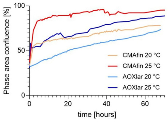 The experiment at different temperatures showed that cells reached confluence significantly faster at 25 °C (Figure 2). In more detail, cells cultivated at 25 °C attached two hours after seeding, whereas cells at 20 °C reached attachment 6 h after seeding. In addition, it was evident how quickly the cells of maraena whitefish (CMAfin1) grew in the higher-temperature setting (Figure 2). At the end of the experimental time, CMAfin1 cells cultivated at 25 °C had a confluence of 92.27 ± 3.5% and AOXlar7y of 85.90 ± 2.8%. Compared to the higher temperature, cells cultivated at 20°C exhibited nearly 20% less confluence within the wells after these 2.5 days of cultivation (CMAfin1: 76.65 ± 2.8% and AOXlar7y: 67.84 ± 4.3%; Figure 2).