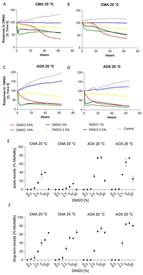 The addition of DMSO indicated how differently the two cell lines could react to the same treatment (Figure 5, Table 3). Analysis of the acute toxicity indicate a more intense response of the CMAfin1 cells at 20 than at 25 °C (Figure 5A,B) where significant differences were already present at 2.5% DMSO compared to the control (Table 3).