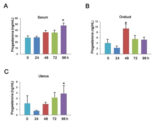 While progesterone affects uterine function and embryo growth, little is known about the P4 level in the uterine environment from a functional perspective during the period of ovulation and preimplantation. To uncover this issue, we induced superovulation in 8-week-old female mice. We evaluated the level of P4 from the serum, oviduct, and uterus by an immunoradiometric assay at 0, 24, 48, 72, and 96 h after induction of superovulation. To characterize the role of the P4 level in embryogenesis, we detected the P4 level in a time course corresponding to ovulation. In the serum and uterine cavity, the P4 level slowly increased and significantly increased at 96 h after induction of superovulation (Figure 1A,C). In contrast, in the lumen of the oviduct, the P4 level dramatically increased at 48 h after induction of superovulation and slightly decreased at 72 and 96 h (Figure 1B). These data suggest that the P4 level is altered in response to ovulation, indicating the essential role of P4 during the preimplantation stage of the blastocyst.