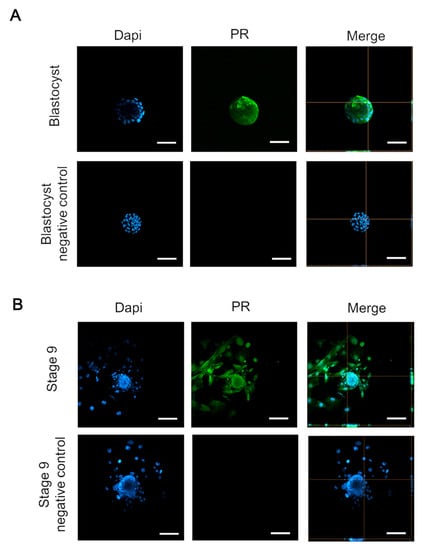 Although the expression and function of P4 receptor (PR) in the ovary has been reported [36], the expression of PR on embryos during embryogenesis remains controversial. Having confirmed the involvement of P4 during blastocysts’ pre-implantation, we further sought to verify the direct effect of P4 during embryonic development. By immunofluorescent staining of PR, we examined the expression of PR in the peri-implantation and post-implantation phases during embryo development. The data showed that the cultured embryos only presented PR during the developmental stage of blastocysts, but not in the one-, two-, and four-cell and morula stages (Figure S1). By using confocal microscopy, we identified that PR was expressed on blastocysts during the pre-implantation stage and in the early egg cylinder phase during the early post-implantation period (Figure 2A,B), whereas the negative controls exhibited no immunoreactivity. These data suggest that PR may modulate post-implantation embryo development from the initiation of implantation.