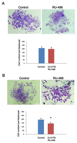Figure 3. Mifepristone interfered with cell proliferation in the blastocysts. (A) Representative image of blastocyst growth following mifepristone exposure for 24 h and (B) 48 h. Quantified data from the blastocysts (bottom panel). Control n = 50; mifepristone n = 45. * denotes p < 0.05 by unpaired t-test. Bar: 50 μm.
