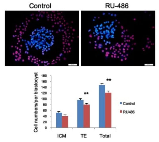 Figure 4. Mifepristone affected cell proliferation in the inner cell mass (ICM) and trophectoderm (TE) during blastocyst outgrowth. Representative differential staining image from cultured blastocysts following exposure in RU-486 for 48 h and followed by culturing for 6 days. Quantified data from the cell number in ICM and TE (bottom panel). Control n = 27, mifepristone n = 25. ** denotes p < 0.01 by unpaired t-test. Bar: 100 μm.