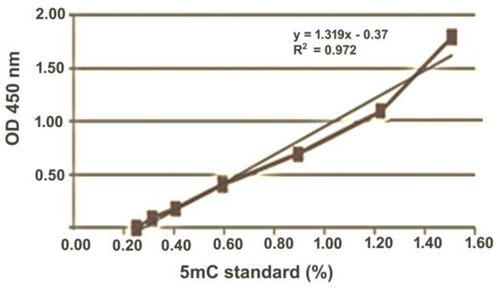 Genomic DNA was isolated from hepatopancreas samples using the GenElute™ Mammalian Genomic DNA Miniprep Kit (Merck KGaA, Darmstadt, Germany) according to the manufacturer’s directions. The DNA purity was checked by UV absorption (260/280 nm, DS-11 Spectrophotometer, DeNovix, Wilmington, NC, USA) [7]. Total 5mC DNA level was quantified using the MethylFlash Global DNA Methylation (5mC) ELISA Easy Kit (EpiGentek, Farmingdale, NY, USA). This kit provides a fast and precise method to determine global DNA methylation changes, with a detection limit of 5 nanograms (ng) of fully methylated DNA. In addition, the use of such ELISA-based assays for serial measurements of 5mC can serve as a cost-effective and reliable alternative to commonly used methods for whole-genome DNA methylation quantitation, such as chromatography, radioactive filter-binding, or bisulfite sequencing-based methods [32,33]. Optical density (OD) was measured at a wavelength of 450 nanometers (nm) with a Stat Fax 4200 microplate reader (Awareness Technology, Palm City, FL, USA). For absolute 5mC quantifications, a standard curve was created by graphing the corresponding ODs versus the log10-transformed concentrations of the positive controls. The coefficients of determination (R2) for ELISA calibration curves were above 0.97; an example is shown in Figure 1.