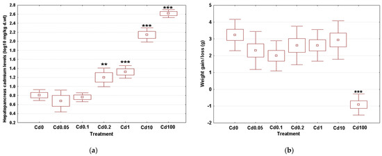 Effect of dietary cadmium on (a) hepatopancreas cadmium levels (n = 4) and (b) body weight gain/loss (n = 8). Metal data are shown on a log10 scale, whereas weight data are given as absolute values. Data sets are depicted as mean (point) with one standard error (box) and one standard deviation (error bar) (Dunnet’s tests, ***—p < 0.001, **—p < 0.01, *—p < 0.05).