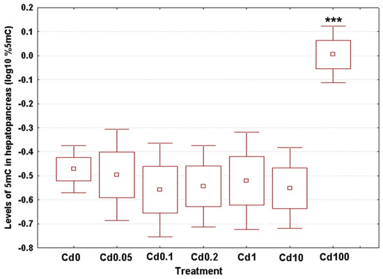 Effect of dietary cadmium on genome-wide 5mC levels in DNA of the hepatopancreas of C. aspersum adults (n = 4). Data are shown on a log10 scale as mean (point) with one standard error (box) and one standard deviation (error bar) (Dunnet’s tests, ***—p < 0.001, **—p < 0.01, *—p < 0.05).