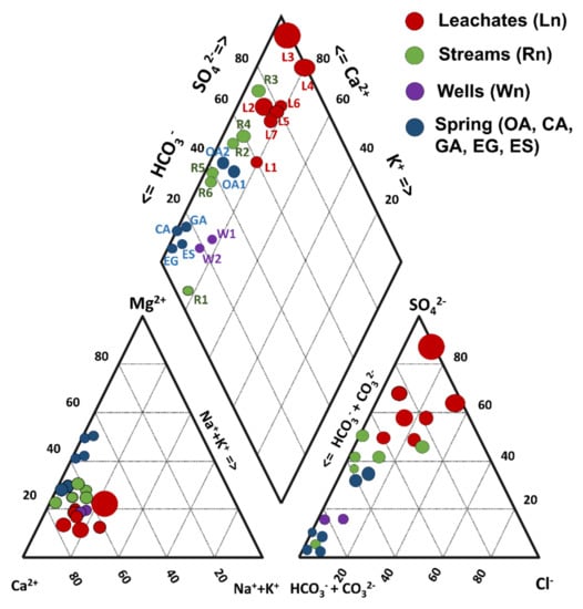 The major anion and cation concentrations in the water samples were used to generate Stiff and Piper diagrams using AquaChem 3.7 software (Waterloo hydrogeologic, Waterloo, ON, Canada). Since EC is considered to be the main chemical marker related to pyrite oxidation and AMD production [48], a Piper diagram was constructed by considering the EC value to normalize the size of the icon of the represented samples (Figure 2). For each aqueous solution sample, the charge balance was calculated using the WATEQ4F database in PHREEQC v. 2.15 [49], and the charge imbalance (CI) was calculated according to Nordstrom et al. [50]. Likewise, the saturation indices (SI) of mineral phases identified by XRD in the mine wastes were calculated using PHREEQC with the Thermoddem database [51]. Relationships between the physicochemical variables analyzed in the water samples were evaluated using Pearson’s correlation tests and principal component analysis (PCA). Pearson’s correlation was used to evaluate the relationship among physicochemical parameters, cations, and anions that were quantified in the leachates, streams, wells, and spring water samples in the study area. The correlation was also used to suggest the reactions driving the presence of major and trace elements in solution for all water samples. Table S1 shows that red and blue numbers have significant positive and negative correlations, respectively (p < 0.05). In the PCA, the eigenvalues and variances were determined to establish principal components (PCs). With PCA diagrams, it is possible to observe the interaction between the variables and samples; a grouping of samples suggests a common source [52].